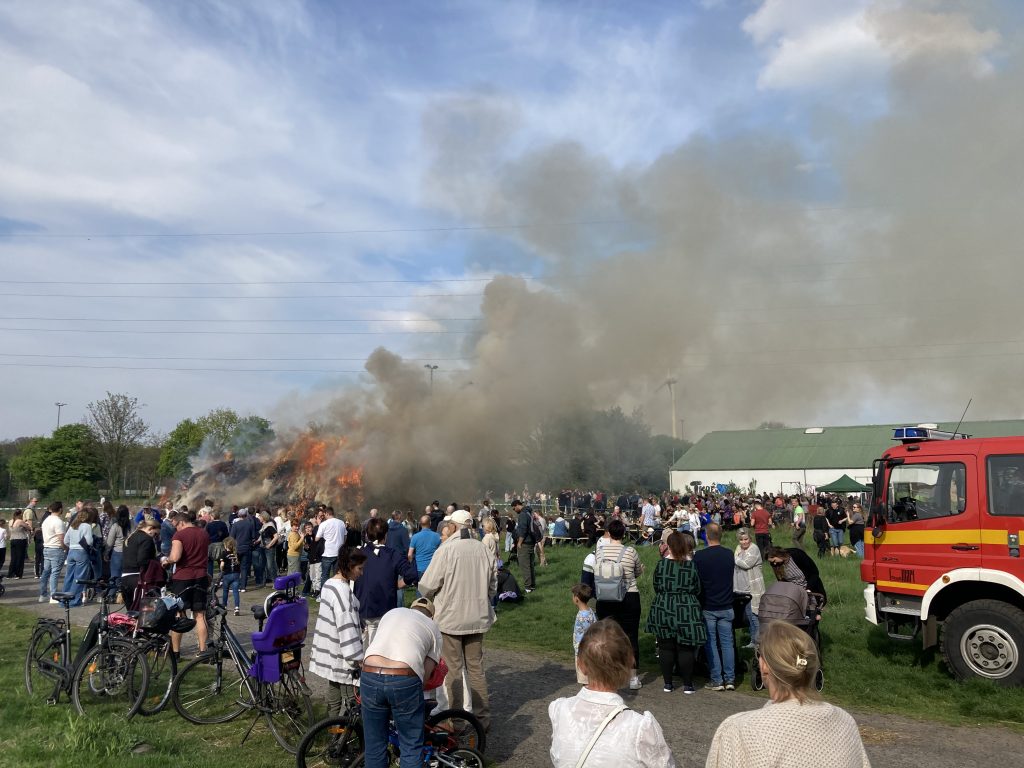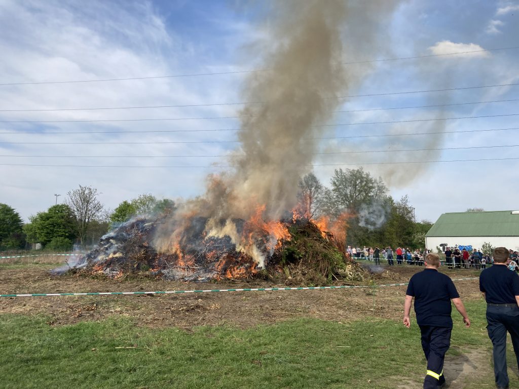 Gut behütet von der Freiwilligen Feuerwehr brannte der gut getrocknete Holzhaufen sehr schnell lichterloh und entwickelte viel Hitze.